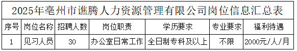 2025年亳州市譙騰人力資源管理有限公司公開招聘有意愿的高校畢業(yè)生30名。